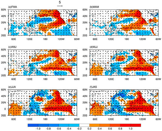 To examine the impact of the VM on SST, precipitation, and surface wind anomalies over the SCS, lagged regressions are calculated with respect to the FMA VMI (Figure 5). During spring (MAM), the VM is associated with a basin-wide tripole SST anomaly pattern in the North Pacific, with a band of positive SST anomalies extending from the west coast of North America to the central equatorial Pacific, a band of negative SST anomalies extending from the central North Pacific to the WNP, and another band of positive SST anomalies in the Pacific north of 35° N. At this time, the SST anomaly pattern associated with the VM in the tropical central eastern Pacific bears a resemblance to a Pacific meridional mode (PMM) pattern, with positive SST anomalies in the northeastern subtropical Pacific and negative SST anomalies in the equatorial eastern Pacific, indicating that the VM is closely linked to the PMM. However, we would like to emphasize that the VM is a basin-scale North Pacific SST pattern. In addition to the PMM pattern, there are significant negative SST anomalies associated with the VM in the WNP. The WNP SST anomalies have been shown to have an important contribution independent of the PMM to the initiation of ENSO events [49]. Therefore, in contrast to the local influence of the PMM, the VM may play a unique role (i.e., as a basin-scale influence) in affecting the tropical Pacific climate [28].