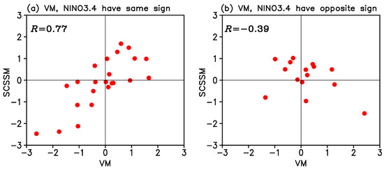 (a) Scatterplot of the FMA VMI versus the following JAS SCSSMI, plotted only for those years in which the FMA VMI has the same sign as the following DJF (December–February) Niño3.4 index; (b) As for (a) but for only those years in which the FMA VMI has the opposite sign as the following DJF Niño3.4 index. In (a) and (b), the correlation coefficient of the FMA VMI with the following JAS SCSSMI is given in the upper left corner.