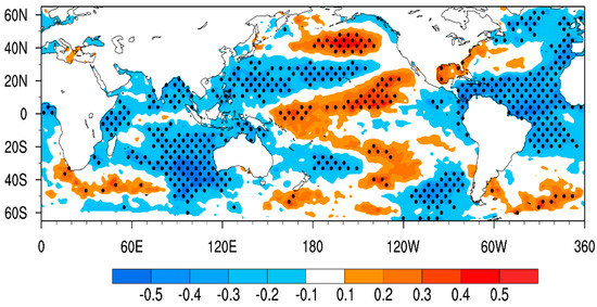 Correlation maps of the summer (JAS) SCSSMI with the previous spring (FMA) SST anomalies. Areas with correlation significant at the 90% confidence level are stippled.