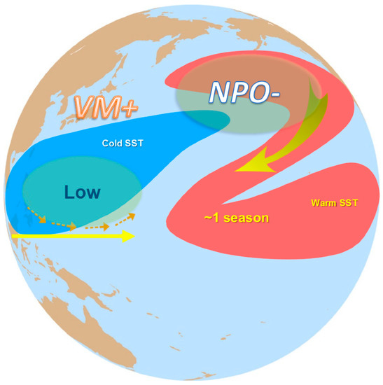 The present analysis reveals that the VM exerts an effect on the SCSSM’s intensity mainly via the so-called seasonal footprinting mechanism. That is, SST anomalies in the subtropics associated with the springtime VM persist into summer and develop gradually toward the equator, resulting in a weakened zonal SST gradient across the WNP to the central equatorial Pacific. Then, changes in the zonal SST gradient in the tropical Pacific produce an anomalous cyclonic flow over the WNP and westerly anomalies in the western equatorial Pacific, thereby intensifying the WNPSM as well as the SCSSM (see Figure 11 for a schematic diagram). At the same time, the VM-induced wind stress anomalies in the western equatorial Pacific are conducive to initiating an ENSO event. Therefore, the VM influence on both the WNPSM and SCSSM is simultaneously associated with its influence on ENSO, indicating that the VM may serve as a useful predictor to enhance predictive skill of both the SCS-WNP summer monsoon and ENSO.
