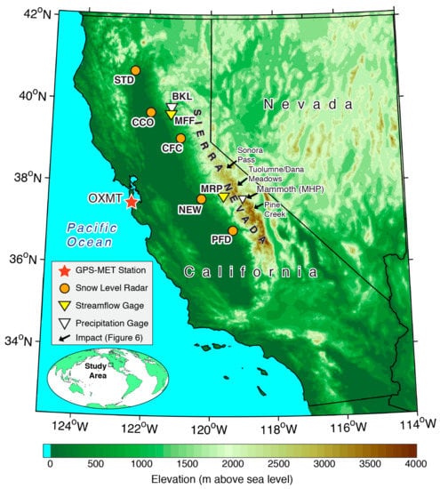 Observations of precipitable water were acquired from ground-based Global Positioning Satellite data acquired near Half Moon Bay along the California coast (station OXMT; Figure 1) from the COSMIC Suominet database [22]. Hourly brightband elevations, or the elevation where snow turns to rain (approximately 200 m below the 0 °C isotherm [23]), were derived from five snow level radars located west of the Sierra Nevada crest (Figure 1) [23,24,25,26]. Climatological cool season (October–April) snow levels are provided for the Chico radar from 2002–2018. To provide a comparison of snow levels during the 5–7 April event with other potential typhoon remnant-derived precipitation events, five additional events are included and provided in Table 1.