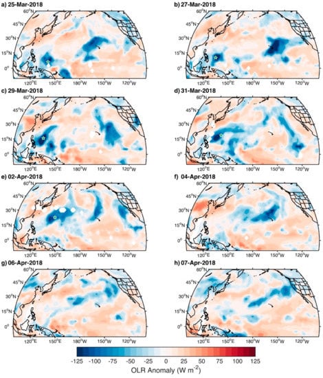 Non-interpolated outgoing longwave radiation anomalies (W m2) for (a) 25 March 2018; (b) 27 March 2018; (c) 29 March 2018; (d) 31 March 2018; (e) 2 April 2018; (f) 4 April 2018; (g) 6 April 2018; (h) 7 April 2018. The green star denotes the approximate center of the typhoon based on Japanese Meteorological Agency Regional Specialized Meteorological Center (RSMC) Tokyo-Typhoon Center best track data [17] for panels (a–d). The typhoon center is estimated for panel (e) based on analysis of MERRA 1000 hPa geopotential height and sea level pressure [20].