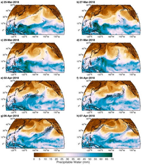 On 25 March 2018, super typhoon Jelawat can be identified as a region of negative OLR anomalies centered at 140° E, 8° N (Figure 2a) and as a region of precipitable water exceeding 65 mm and demonstrating radial inflow (Figure 3a). Between 25–29 March, Jelawat migrated northeastward with convective outflow to the northeast as indicated by increasing negative OLR anomalies (Figure 2b,c) and enhanced precipitable water (Figure 3b,c). This outflow merged with enhanced convection centered at 140° E, 8° N on 31 March (Figure 2d). As Jelawat dissipated between 2–4 April, enhanced convection continued eastward across the Pacific along a band centered between 20° N and 30° N (Figure 2e,f). Negative OLR anomalies are observed on the equatorward side of an Aleutian low centered at the dateline (180° W; Figure 3c,d). Moisture from the remnants of Jelawat after 31 March and convective outflow from western tropical Pacific convection (Figure 2d,e) is evident in the precipitable water observations (Figure 3c–e). This moisture was entrained in the primary Aleutian low centered at the dateline (Figure 3d) before being zonally elongated by subsidiary lows moving eastward from the parent low (Figure 3e,f) towards North America. A canonical AR formed on 4 April (Figure 3f) and made landfall between 6–7 April (Figure 3g,h) with integrated vapor transport in excess of 1000 kg m−1 s−1. Just prior to and during landfall, negative OLR anomalies are observed poleward of the AR (Figure 2f–h).