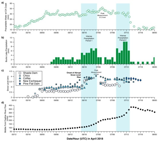 (a) Time series of precipitable water (mm) at the California (CA) coast near Half Moon Bay; (b) precipitation observations (mm) at Bucks Lake, California; (c) brightband-derived snow levels at five snow level radars upstream of the Sierra Nevada crest (km; ordered from north to south) and (d) observed streamflow (cms) on the Middle Fork of the Feather River. Vertical blue bars denote the two periods of intense precipitation.