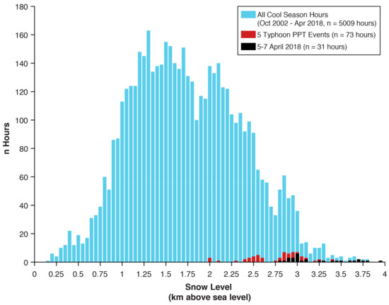 Histogram of hours of observed snow levels (km) at Chico, California for all cool seasons (October–April; blue bars), five other typhoon remnant-related precipitation (PPT) events (red bars; composed of six typhoon remnants), and the 5–7 April 2018 event (black bars).