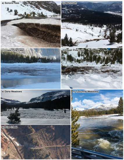 Field observations of examples of hydrogeomorphological impacts of the event were recorded in high elevation regions of the Sierra Nevada between 15 April–10 May 2018 by Susan Burak, the Eastern Sierra Avalanche Center [29], Rob and Laura Pelewski [30] and the author. Observations of debris flows, high elevation flooding, and wet snow avalanches were conducted using ground-based and aerial photography.