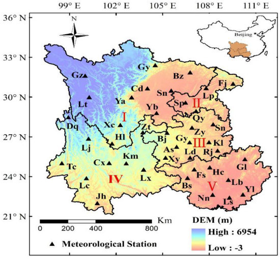 Southwest China (SC), which covers an area of approximately 1.23 million km2 or 12.9% of China’s total area, lies between latitudes 20°54’ N and 34°19’ N and longitudes 91°21’ E and 112°04’ E. SC includes five provinces, which are called Sichuan (I), Chongqing Municipality (II), Guizhou (III), Yunnan (IV), and the Guangxi Zhuang Autonomous Region (V), which is illustrated in Figure 1.
