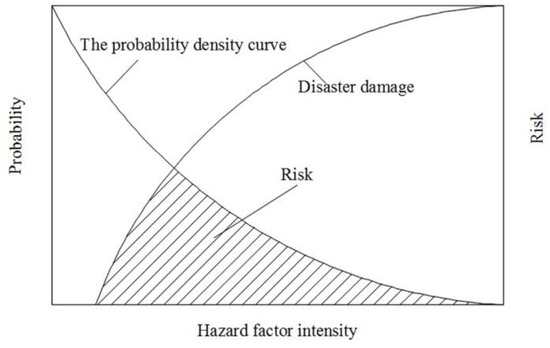 When conducting a risk assessment, a common basic pattern is as follows: R = H•D [11,13,14], where R is the risk, H is the function that describes the risk source, D is the vulnerability function that describes the risk-bearing bodies (referring to crop in this study), and ‘•’ is a synthesis rule. When the analyzed risk is expressed as the expected value of the damage, the index system is described by the ‘damage’ D, and the “probability” H. The ‘•’ indicates multiplication. The simplest solution is to calculate the area surrounded by the probability density curve, the disaster damage curve, and abscissa axis, which is shown in Figure 2.