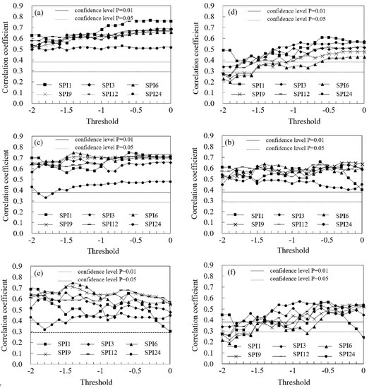 - Wang, Y.F.; Chen, X.W.; Chen, Y.; Liu, M.B.; Gao, L. Flood/drought event identification using an effective indicator based on the correlations between multiple time scales of the Standardized Precipitation Index and river discharge. Theor. Appl. Climatol. 2017, 128, 159–168. [Google Scholar] [CrossRef]