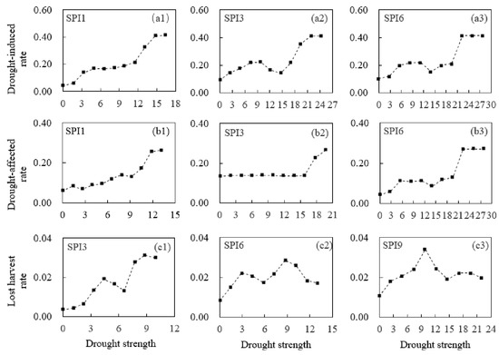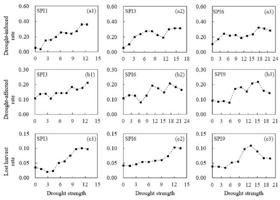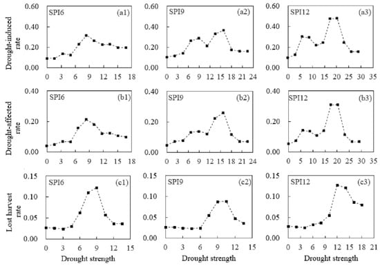 The vulnerability relationships between drought strength (DS) and drought damage rates (DDR) in the Yunnan Province. (a1,a2,a3) represent the vulnerability relationship between DS calculated by SPI3, SPI6, and SPI9 and the drought-induced rate (I1), respectively. (b1,b2,b3) represent the vulnerability relationship between DS calculated by SPI6, SPI9, and SPI12 and the drought-affected rate (I2), respectively. (c1,c2,c3) represent the vulnerability relationship between DS calculated by SPI6, SPI9, and SPI12 and the lost harvest rate (I3), respectively.