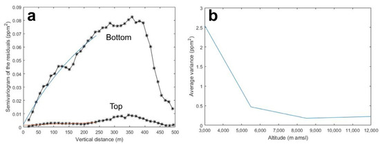 (a) Example variograms of the residuals at 200 and 8500 m altitude (window size ±500 m) for CO2 (01/14/2012); (b) Height dependence of the average estimated variance for CO2 of the residuals (window size ±500 m) for the entire dataset.