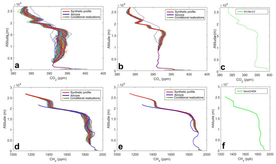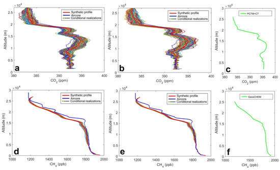 Sampled and reconstructed fraction of the CO2 column (24 October 2012) (a,b), and CH4 (17 September 2014) (d,e) showing ensemble conditional realization cloud based on the covariance parameters inferred at the top of the sampled partial column. Modeled profiles for CO2 and CH4 are given in (c,f), respectively. Red line extending from the top of the sampled fraction upward represents the synthetic profile. Simulated sampled column altitude range was: (a) h < 3000 m and (b) h < 8500 m, visible in the profiles as the altitude ranges where conditionally simulated ensembles are missing.