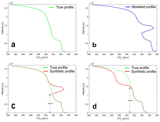 Depiction of the key elements of a thought experiment: (a) assumed true profile; (b) assumed modeled profile; (c) true and reconstructed profile assuming sampling up to 10 km; and (d) assumed true and reconstructed profile assuming sampling up to 14 km.