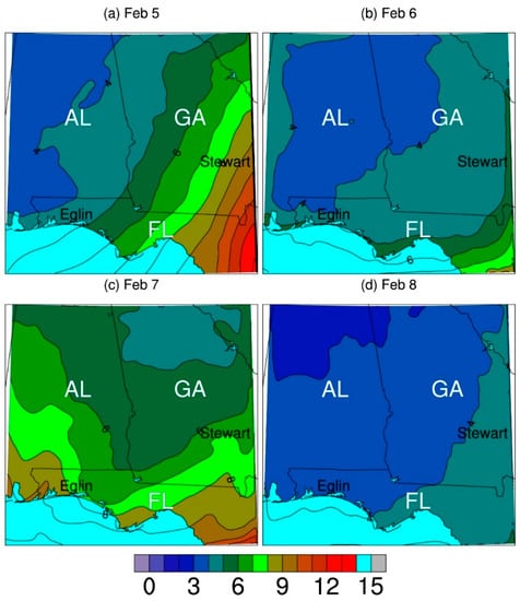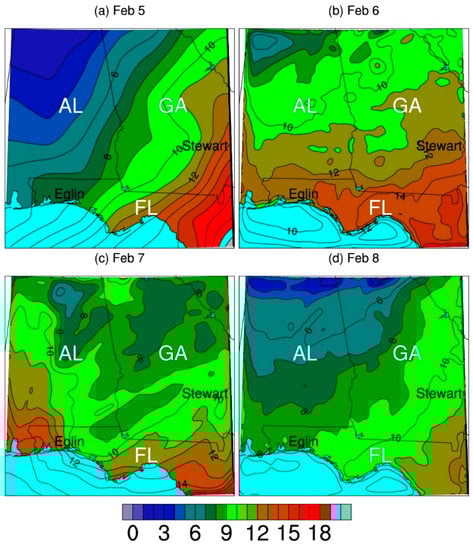 On 5 February, the surface temperature, which is about the same as potential temperature on the ground, simulated with WRF increases from about 3 °C in northwestern Alabama (AL) to about 20 °C in southeastern Georgia (GA) and northeastern Florida (FL) (Figure 1a). The simulated surface specific humidity shows the same spatial distribution, increasing from about 3 to 15 g/kg (Figure 2a). The simulated gradient is the largest for both fields near the GA-FL border. Westerly winds prevail at about 850 hPa (1.5 km) elevation (Figure 3a). Winds change from slightly northwesterly at about 15 m/s in northern AL to southwesterly at about 25 m/s in northern GA. The weather pattern on this day is characterized by a cold front oriented from southwest to northeast near the GA-FL border on the ground, as indicated by the noticeable changes from the northwest to southeast of the simulation domain in surface temperature and humidity, and a shallow trough in northern AL and GA at 850 hPa. As shown below, the spatial changes are much smaller on the other three days with the cold front moving out of this region. On February 6th, the temperature increases in northwestern AL but slightly decreases in southeastern GA and northern FL (Figure 1b). The specific humidity is reduced remarkably in southeastern GA and northern FL (Figure 2b). Thus, both the temperature and humidity gradients are reduced. The westerly winds at 850 hPa remain, but the direction is now from southwesterly in northern AL to northwesterly in northern GA (Figure 3b). The spatial distributions of the weather elements indicate the cold front on 5 February moved out of the simulation domain and the shallow trough is replaced by a weak ridge.