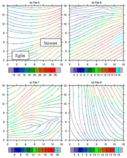 Streamlines and wind speed (m/s) at 850 hPa simulated with WRF. (a–d) are 5–8 February 2011 at noon local time. Wind speed is indicated by color.