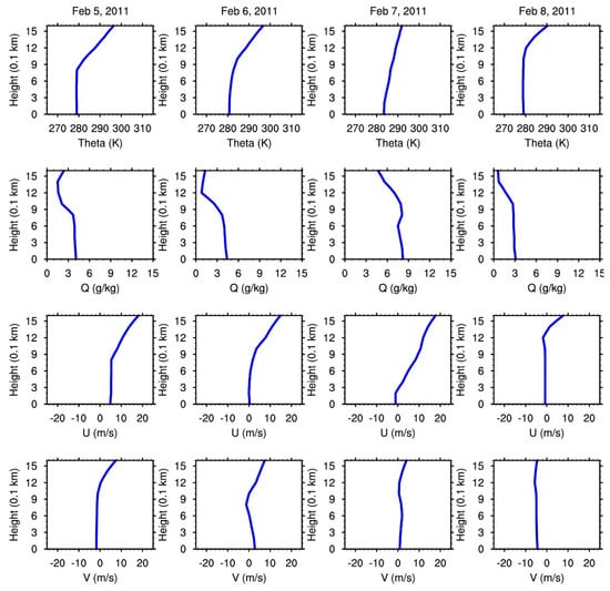 Vertical profiles of potential temperature (K) (top), specific humidity (g/kg) (second row), westerly and southerly wind components (m/s) (third and fourth rows) at Eglin simulated with WRF. The columns from left to right are 5–8 February 2011 at noon local time.