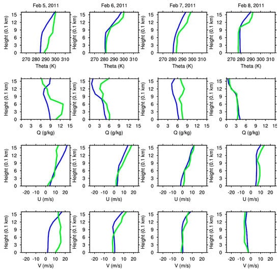 Vertical profiles of potential temperature (K) (top), specific humidity (g/kg) (second row), westerly and southerly wind components (m/s) (third and fourth rows) at Fort Stewart simulated with WRF (blue) and Jacksonville, FL observed from radiosonde (green). The columns from left to right are 5–8 February 2011 at noon local time.