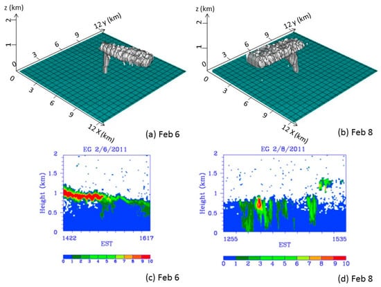Smoke plumes at Eglin on 6 and 8 February at 1400 local time. (a,b) are Daysmoke simulations. (c,d) are the corresponding ceilometer detections with the horizontal axis indicating local time (from [24]).