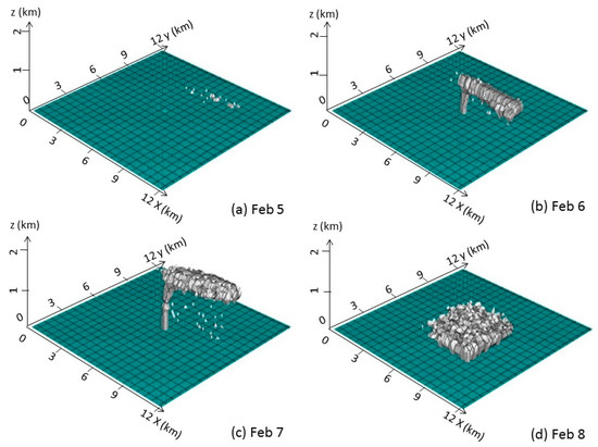 On 7 February, the temperature decreases slightly from 6 February (Figure 1c), but the specific humidity increases (Figure 2c). The winds are southwesterly (Figure 3c). All these changes indicate that the simulation domain is located in the eastern section of another trough system with a trough line located west to the domain. On 8 February, the temperature reduces slightly again (Figure 1d), and the specific humidity decreases dramatically (Figure 2d). The winds are northerly (Figure 3d). The domain is located behind the trough line.
