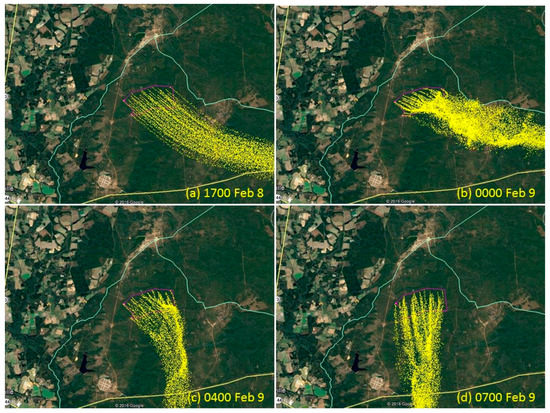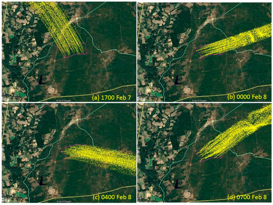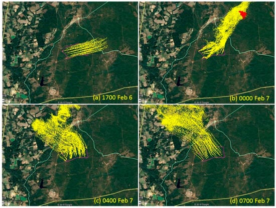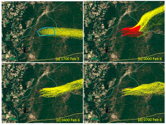 PB-P simulation of smoke during night of 8 February 2011 at four times (a–d). Yellow indicates smoke particles. The pink area is the hypothetical burn site of Block 3.
