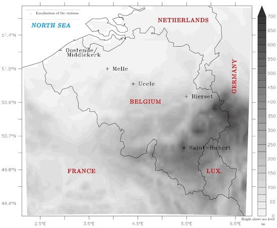 Eg↓ data were supplied by GEBA and by the Royal Meteorological Institute of Belgium (RMIB). The GEBA Eg↓ dataset consists of monthly mean Eg↓, which was measured by well-calibrated instruments and underwent rigorous quality checks [,]. The relative random error of GEBA data was found to be approximately 2% of the annual mean values []. Four time series consisting of at least 30 years are available for Belgium in the GEBA data set, as listed in Table 1. The RMIB has a long-term experience with ground-based measurements of Eg↓ in Belgium with uninterrupted measurements at Uccle since 1951 []. Uccle is one of the 22 Regional Radiation Centres established within the World Meteorological Organisation (WMO) regions. In addition to Uccle, RMIB provided Eg↓ data from three other stations (Table 1). These data consist of monthly mean Eg↓ calculated from 30 min-average measurements. The time-series from GEBA are the same as those from RMIB, with the difference between them lower than 1%. Since the RMIB time-series are longer, we removed these redundant GEBA time-series from our dataset, so that we finally used Eg↓ data from the four RMIB stations shown in Figure 1: Melle, Middlekerk/Oostende, Saint-Hubert, and Uccle. Seasonal and annual mean Eg↓ were then computed using the monthly data. However, if more than one month was missing within a year, the annual mean was not computed; otherwise, the mean Eg↓ for the year was computed by filling the missing month by the climatic average of this month for the period covered by the time series. The seasonal mean Eg↓ values are not computed if there are gaps in the monthly data.