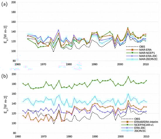 Finally, we observe the same general behaviour for Eg↓ modelled by MAR compared to Eg↓ directly from the driving reanalyses. The values of R between reanalyses and measurements are as high as between MAR and the measurements. MB, for its part, is largely reduced in MAR compared to the reanalyses (Figure 2b and Figure 4b). For instance, MAR-NCEP1 shows an annual MB of +7.7 W m−2 while this value reaches +64.3 W m−2 in NCEP/NCAR-v1, which is in agreement with the findings of Zhang et al. []. We also find differences between ERA40 (1962–1978) and ERA-interim (1979–2010), which are fortunately not observed in the associated MAR simulation (MAR-ERA) (Figure 2). Indeed, ERA40 systematically underestimates Eg↓ (annual MB = −5.00 W m−2), while ERA-Interim overestimates Eg↓ (annual MB = +15.6 W m−2) in agreement with Zhang et al. []. In addition, the forcing reanalyses and MAR have generally comparable CRMSE values. This is because the interannual variability of MAR is fully driven by the forcings. However, the forcing reanalyses exhibit much larger RMSE than MAR because of their larger biases.