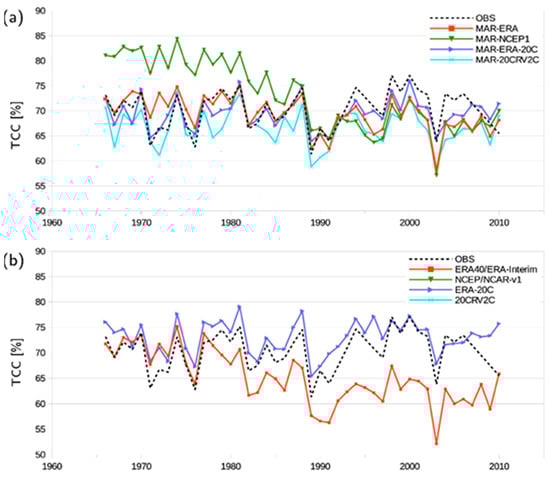Regarding annual mean TCC, models do not compare as well to observations (Figure 3 and Figure 5). For the period 1966–2010, TCC modelled by MAR at Saint-Hubert shows R values ranging from 0.18 (MAR-NCEP1) to 0.82 (MAR-ERA-20C) (Figure 5a). We find MB values for MAR ranging from −3.6% (MAR-20CRV2C) to +3.0% (MAR-NCEP1) (Figure 5b). Values of CRMSE range from 2.2% (MAR-ERA-20C) to 7.1% (MAR-NCEP1) (Figure 5c), and are smaller than the interannual variability (Figure 5d). As for Eg↓, the MAR performances also depend on the season. In the summer, R is the lowest, and does not exceed 0.57 in MAR-ERA. Meanwhile, MB values are negative, and range from −5.2% (MAR-ERA-20C) to −13.9% (MAR-20CRV2C), while the CRMSE of MAR-20CRV2C reaches 9.8% in summer. In winter, the R values are among the largest, reaching 0.72 in MAR-ERA. Values of MB are positive, and range from +3.0% (MAR-ERA-20C) to +8.4% (MAR-NCEP1) with the largest CRMSE in winter reaching 4.8% in MAR-NCEP1. As for Eg↓, this comparison highlights that MAR-NCEP1 shows the worst results. In order to explain this apparent artefact in TCC modelled by MAR-NCEP1, we have compared all three cloud types computed by MAR: low cloud cover (LCC), which is defined as the cloud fraction below 680 hPa, medium cloud cover (MCC), which is defined as the cloud fraction between 680–440 hPa, and high cloud cover (HCC), which is defined as the cloud fraction above 440 hPa (Figure S7, Supplementary Materials). The results suggest that this artefact likely results from an inaccurate simulation of HCC, and therefore from biases in the forcing fields of MAR in the high troposphere (Figure S7c).