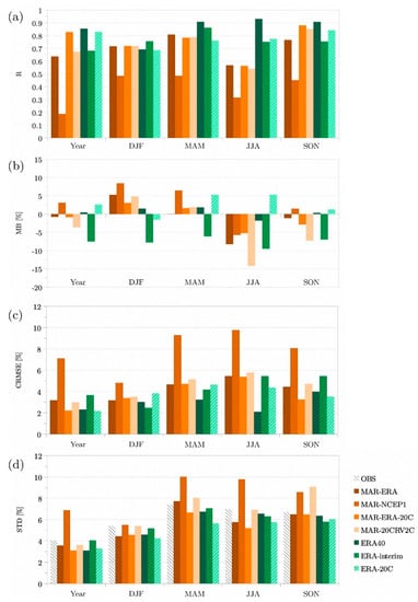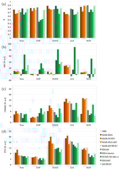 Over 1962–2010, regarding annual mean Eg↓ modelled by MAR, MAR-ERA shows the best agreement with observed Eg↓ at Saint-Hubert, with a correlation coefficient (R) of 0.77. MAR-NCEP1 performs the worst, with R = 0.66 (Figure 2a and Figure 4a). The centred root mean squared error (CRMSE) is the smallest for MAR-ERA-20C (CRMSE = 6.2 W m−2), the largest for MAR-NCEP1 (CRMSE = 8.0 W m−2) (Figure 4c), and smaller than the interannual variability (the standard deviation (STD) of the observations) (Figure 4d). Furthermore, the comparison suggests that MAR slightly overestimates Eg↓ with mean annual biases (MB) ranging from +7.7 W m−2 (MAR-NCEP1) to +9.9 W m−2 (MAR-ERA) (Figure 4b). On a seasonal time-scale, we find the lowest values of R in the summer (June–July–August, JJA) ranging from 0.62 (MAR-20CRV2C) to 0.70 (MAR-ERA), while CRMSE was among the largest, with values above 13.8 W m−2. The other seasons exhibit values of R of at least 0.72 (MAR-NCEP1 in autumn (September–October–November, SON)). The lowest CRMSE was found in winter (December–January–February, DJF) with values below 3.9 W m−2 (MAR-NCEP1). MAR tends to overestimate Eg↓ for all of the seasons except winter. We find the largest MB in the summer, with values ranging from +22.3 W m−2 (MAR-ERA-20C) to +29.2W m−2 (MAR-20CRV2C). In winter, MB is negative, and ranges from −3.9 W m−2 (MAR-NCEP1) to −0.1 W m−2 (MAR-ERA-20C)-.