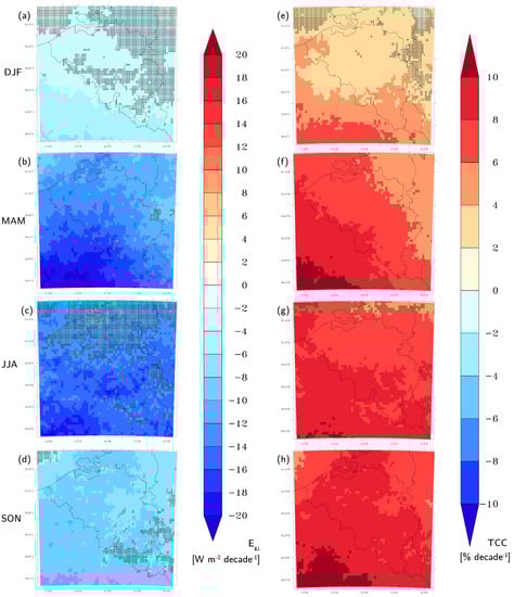 Over 1959–1979 (dimming period), the MAR-ERA outputs show an overall significant decrease in Eg↓ for all of the seasons (Figure 6a–d). The decrease in Eg↓ is especially marked in spring (March–April–May, MAM) and summer, and reaches values between −16 and −18 W m−2 decade−1 in some regions of the country (Figure 6b,c). Chiacchio and Wild [] and Sanchez-Lorenzo et al. [] found similar results over a larger European domain. MAR-ERA show a significant increase in TCC in all of the seasons Figure 6e–h). This increase in TCC is the most marked in spring, summer, and autumn, and can reach values between +8 and +10% decade−1 in some parts of the country (Figure 6f–h).