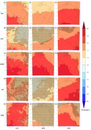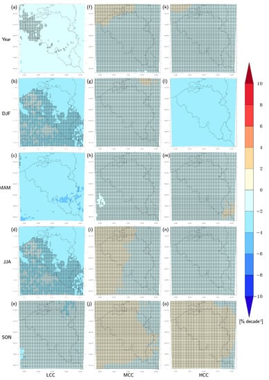 Seasonal trends in (a–e) LCC, (f–j) MCC, and (k–o) HCC computed from the MAR-ERA outputs for 1980–2010 (brightening period). Filled pixels indicate the places where the trends are statistically significant at the 95% confidence level. Hashed pixels indicate the places where the trends are statistically non-significant.