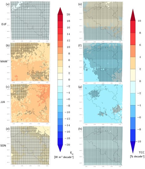 Seasonal trends in (a–d) Eg↓ and (e–h) TCC computed from the MAR-ERA outputs for 1959–1979 (dimming period) over the study region, as shown in Figure 1. Filled pixels indicate the places where the trends are statistically significant at the 95% confidence level. Hashed pixels indicate the places where the trends are statistically non-significant.