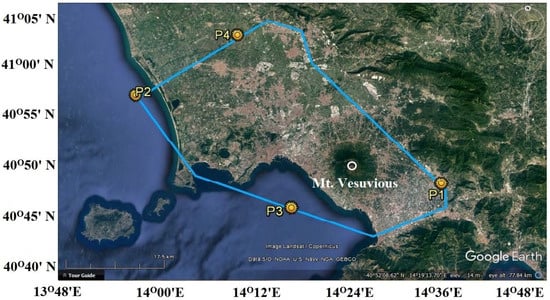 Aircraft observations were performed over an area of circa 1300 km2, situated in Campania region (Southern Italy) and roughly centered in the city of Naples (40°51′ N, 14°21′ E), which is bounded by the Appennini and anti-Appennini mountains to the east and southeast, and by Naples Bay and Tyrrhenian sea to south and west (Figure 1). The surface encompassed by flights is mainly made of flat land that is part of the two plains extending northwest of Naples and southeast of Mount Vesuvius and is surrounding the strip of conurbation that spreads from Naples to Caserta. This urban area is recognized as the largest metropolitan area in the Mediterranean Basin []; it is often affected by high pollution due to anthropogenic activities associated with calm and stagnant air masses, and its effect on health is a concern for the scientific community and policy makers [,,,].The remaining surface is occupied by agricultural land and small industrial districts [].