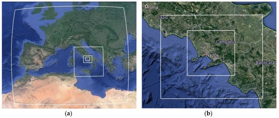 Geographic location of Weather Research and Forecasting (WRF) four nested domains (a) and a zoom over the two inner ones, covering the Campania Region and Naples (b). Image source: Google Earth.