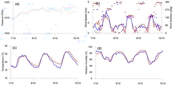 Napoli Capodichino airport (LIRN) surface meteorological observations (blue) and WRF simulation results with the Mellor–Yamada–Nakanishi–Niino Level 2.5 (MYNN2)planetary boundary layer (PBL) scheme (red) for: (a) pressure; (b) wind speed and direction; (c) air temperature; and (d) relative humidity.