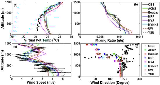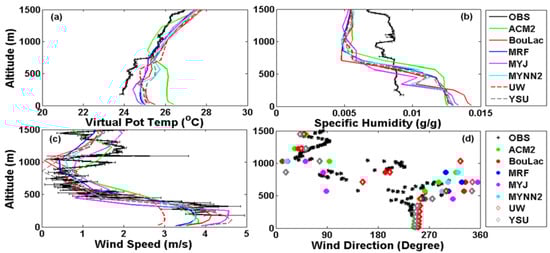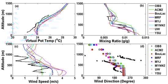 To get insights regarding the chosen PBL schemes with respect to observations, we have selected Flight 3 profiles in the present work. As mentioned earlier, Profile 1 (Figure 5) is overland, whereas Profile 2 (Figure 6) and 3 (Figure 7) are over sea, and Profile 4 (Figure 8) is again over land. The overall comparison shows that the main features of the vertical layering of the atmosphere are captured by WRF simulations with all of the considered PBL schemes. The wind speed is everywhere decreasing with height, with a SW direction near the surface and a strong shear in both direction and speed between 500–1000 m agl. Weak winds are observed from NE–SE in the upper monitored layers. The development of the modeled boundary layer matches the vertical location of the major temperature gradient, and correctly reproduced the upper layer temperature slopes. This generally indicates a reasonable reconstruction of the PBL depth and its time variation, even if the virtual potential temperature is generally overestimated in the lower atmospheric layers located within the PBL. It is worthwhile to remember that the growth of the PBL is not monotonic over land due to the development of the thermal internal boundary layer, which follows the sea breeze front penetration.