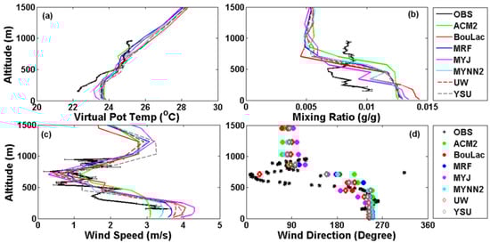 The detailed comparison of the different PBL schemes’ performance with virtual potential temperature measured at PRF4 above land (Figure 8a) show similar results in the lower 1000 m for all parameterization, while MYJ is closer to the measurements. On the other hand, MYJ and BouLac show larger errors over 1000 m, where MRF, ACM2, and MYNN2 better fit the virtual potential temperature measurements. MYJ shows also larger discrepancies than the other schemes with respect to specific humidity below 1000 m (Figure 8b). Wind speed (Figure 8c) observations are quite fluctuating along the entire profile, which is a feature that makes their comparison with model results difficult. The observed fluctuations must be considered a subgrid variation considering both horizontal and vertical resolution. The overall variation of wind speed with height is reproduced by almost all of the PBL schemes, with ACM2, MYNN2, and MRF performing best, and the tendency of YSU to overestimate near surface wind speed.