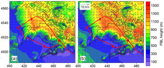 PBL height (m) predicted by WRF model simulations for 8 October 2014 at 13:00 GMT with MYNN2 (panel a) and Yonsei University (YSU) (panel b) PBL parameterization. Wind field at 10-m height is represented by grey arrows (one arrow out of four). The red line superposed represents the flight track.
