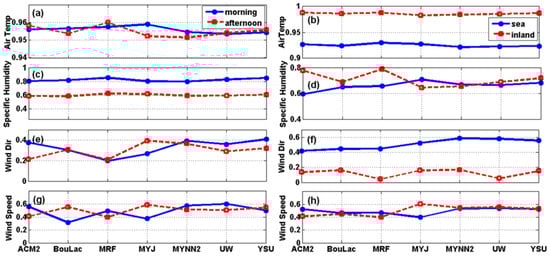 Variation of Pearson coefficient for PBL schemes used in the present study for all of the flights (flights 1–5) for air temperature, specific humidity, wind direction, and wind speed for morning/afternoon (a,c,e,g) and over sea/inland (b,d,f,h) respectively.