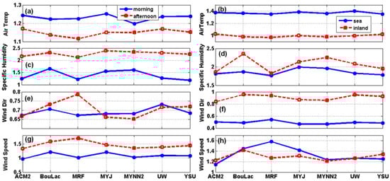 Variation of root mean square error (RMSE) for PBL schemes used in the present study for all flights (flights 1–5) for air temperature, specific humidity, wind direction, and wind speed for morning/afternoon (a,c,e,g) and over sea/inland (b,d,f,h) respectively.