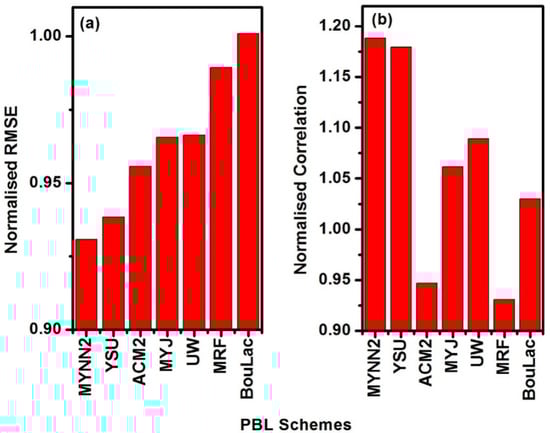 The normalized RMSE and correlation values for Figure 12 are obtained using the ratio of RMSE/correlation value of a particular scheme divided by the mean value of all of the schemes. This normalization allows values to go above or below 1, as the average value (by considering all of the schemes) is lower/higher than an individual scheme value that is performing better/worse than the average. In case of normalized RMSE, MYNN2 is the best-performing scheme (Figure 12a), as the value of RMSE for MYNN2 is less than the average value calculated, which gives the lowest normalized RMSE value for MYNN2. Similarly, Figure 12b shows that MYNN2 again is having the highest correlation (greater than one in this case), which is a result of normalization.