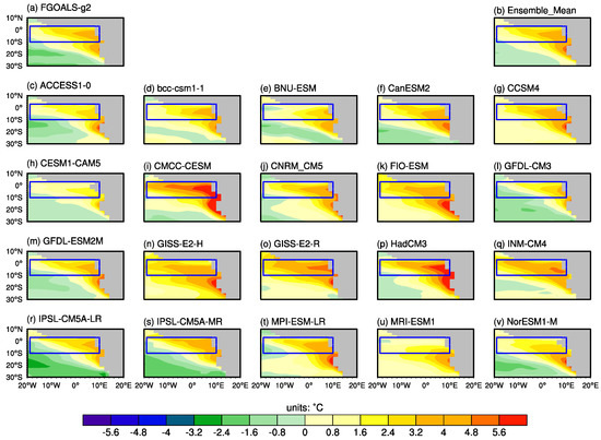The seasonal mean sea surface temperature (SST; unit: °C) bias over the southern tropical Atlantic during June–August (JJA) from 1979–2005 for different coupled climate models (CCMs) of CMIP5 and their ensemble means. The blue box denotes the Atlantic Cold Tongue (ACT; 10° S–3° N, 20° W–10° E) region.