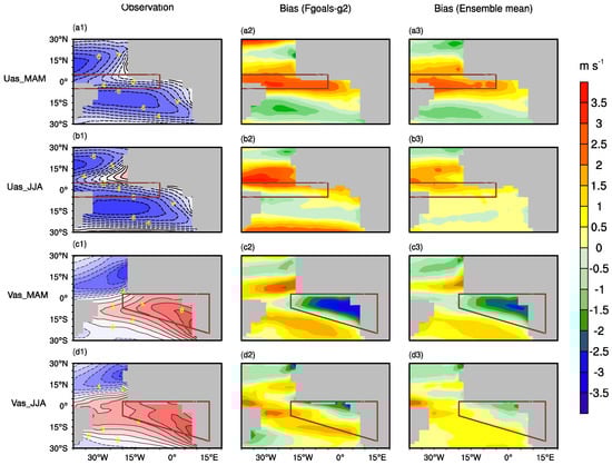 As for the zonal wind, in the observational data, there are strong prevailing easterly winds along the equator during MAM (Figure 2(a1)). In FGOALS-g2, the equatorial easterly wind is underestimated and associated with a westerly bias (Figure 2(a2,b2)). The westerly bias is distinct during MAM and is mainly concentrated in the western and central parts of the Atlantic equator (Figure 2(a2)). This is similar to the bias in most of the CCMs of CMIP5 (Figure S2) and their ensemble means (Figure 2(a3,b3)). There is also a serious northerly wind bias over the ACT region in the FGOALS-g2 model (Figure 2(c2)). In the observations, there are prevailing southerly winds across the equator year-round (Figure 2(c1,d1); not shown during SON and DJF). The northerly bias is more severe during MAM than during JJA (Figure 2(c2,d2)). This meridional wind bias in FGOALS-g2 is similar to that in most of the CCMs of CMIP5 (Figure S3) and similar to their ensemble means (Figure 2(c3,d3)).