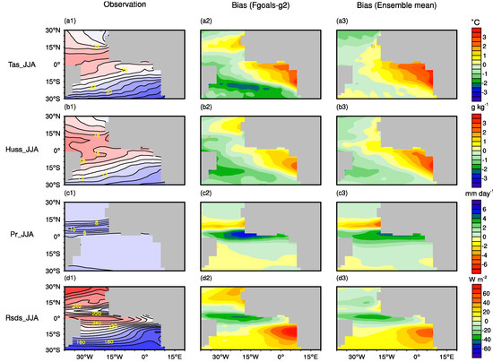 Over the equatorial Atlantic, there is intense precipitation (Figure 3(c1)). FGOALS-g2 has a large wet bias over the southern equatorial Atlantic and a large dry bias over the northern equatorial Atlantic (Figure 3(c2)). These remarkably large biases are similar to those in other CCMs in the CMIP5 (Figure S6) and their ensemble means (Figure 3(c3)).