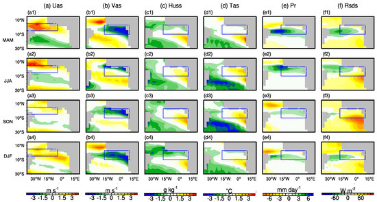 The results of our study support the findings by Richter et al. [24,37] that the westerly bias along the equator during MAM (with a contribution ratio of approximately 32.6% in our study) plays a leading role in inducing the warm bias over the ACT region during JJA. Compared to previous studies, there are new findings in our study. First, results in this study indicate the northerly wind biases over the southern tropical Atlantic during MAM and JJA (with a contribution ratio of approximately 21.4%) also play important roles in inducing the warm bias during JJA over the ACT region and the northerly wind bias during SON play a leading role (approximately 31.2%) in inducing the warm bias over the ACT region during SON. The northerly wind bias over the southern tropical Atlantic has both local and non-local effects on the warm SST bias over the ACT region. Second, the biases in surface specific humidity and surface air temperature mainly contribute to the warm SST bias over the ACT region during JJA (approximately 11.9%) and SON (27.9%) and have cooling effects on the warm SST bias during MAM and DJF. Moreover, there are feedback processes existing between biases in surface specific humidity and air temperature and the warm bias over the ACT region. Third, the bias in shortwave radiation mainly contributes to the warm SST bias over the ACT region during JJA (approximately 6.5%) and SON (approximately 17.4%) and is not a source of the warm SST bias over the ACT region during MAM and DJF. Note that the biases in surface specific humidity, surface air temperature, and shortwave radiation mainly have local effects on the warm SST bias over the ACT region. Fourth, the precipitation bias has a relatively weak impact on the SST bias over the ACT region. Therefore, an atmospheric component with better performance in simulating the zonal winds during MAM over the equatorial Atlantic and meridional winds during MAM, JJA, and SON over the southern tropical Atlantic may be helpful in alleviating the warm bias over the ACT region in the CCM.