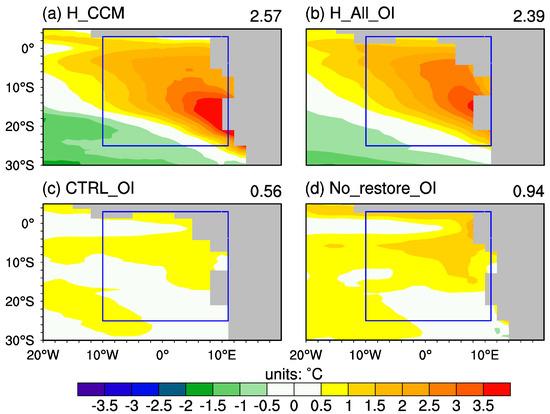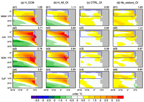 Next, we assess the SST bias of the control experiment CTRL_OI in the ocean-ice model NEMO v3.4. In the CTRL_OI experiment, we applied restoring conditions for both the SST and sea surface salt (SSS). As a consequence, the seasonal mean and annual mean of the SST biases over the ACT region and SETA region are much smaller (Figure 5c and Figure 6c) relative to the previous studies [11,18]. The RMSE of the SST in the ACT region during JJA is 0.82 with the largest value exceeding 1 (Figure 5(c2)) and the RMSE of the SST over the southern tropical Atlantic is 0.56 (Figure 6c). A similar experiment, except without any restoring conditions, is conducted to evaluate the impact of the restoring conditions (Figure 5d and Figure 6d). In this experiment (No_restore_OI), the RMSE of the SST during JJA is 1.41 , with the largest value exceeding 2 in the ACT region (Figure 5(d2)) and the RMSE is 0.94 with the largest value exceeding 1.5 in the southern tropical Atlantic region (Figure 5(d3) and Figure 6d), which is consistent with previous studies [11,18]. It is worth noting that the impacts of the restoring conditions on the SST RMSE during the four seasons are different. The SST RMSEs during MAM, JJA, SON, and DJF in the experiment with restoring conditions (CTRL_OI experiment) are decreased by 0.51 , 0.59 , 0.41 , and 0.32 , respectively (Figure 5c,d), relative to those in the experiment without restoring conditions (No_restore_OI experiment). These differences in SST RMSEs between the two experiments correspond to about 48.6%, 15.9%, 14.9%, and 35.2% of the SST RMSEs over the ACT region in the experiment H_CCM during MAM, JJA, SON, and DJF. Therefore, the impacts of the restoring conditions on the SST bias over the ACT region are relatively smaller during JJA and SON compared to the other two seasons, indicating that the use of the restoring conditions in examining the SST bias over the ACT region during JJA and SON will not strongly affect the results. Moreover, the restoring conditions could alleviate the SST bias induced by the oceanic sources, which, in turn, could help us emphasize the impacts of the atmospheric sources. Notably, we applied restoring conditions on the SST and SSS to all the ocean-ice experiments with a restoring time scale of 50 days except the No_restore_OI experiment.