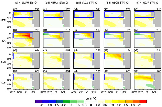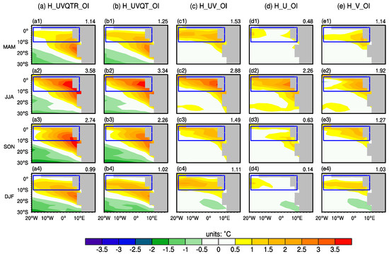 The same as in Figure 7, but for H_U(MAM_Eq)_OI (a); H_V(MAM_STA)_OI (b); H_V(JJA_STA)_OI (c); H_V(SON_STA)_OI (d); and H_V(DJF)_OI (e).