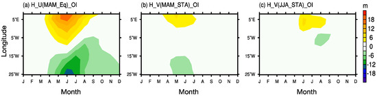 Figure 8 shows the seasonal mean SST bias over the southern tropical Atlantic for all four seasons. To verify the role of the zonal wind bias during MAM along the equator, we perform the H_U(MAM_Eq)_OI experiment, which is similar to the CTRL_OI run, except where the zonal wind forcing during MAM along the equator is from the H_CCM experiment. H_U(MAM_Eq)_OI shows a significant warm SST bias over the ACT region during JJA. This indicates that the westerly bias during MAM along the equator is a main source of the warm bias during JJA over the ACT region and the contribution ratio is approximately 32.6% (Figure 8a). This zonal wind bias enhances the SST bias over the ACT region by 0.17 during MAM, 0.10 during SON, and 0.01 during DJF, which indicates that the zonal wind bias during MAM is not the main source of the warm bias during these three seasons, which is consistent with previous studies. The westerly bias during MAM along the equator enhances the warm bias during JJA and can be explained by the deepening of the thermocline in the ACT region during MAM and JJA (Figure 9a), which has been mentioned in previous studies by Richter et al. [24,37]. The deepening of the thermocline during MAM is accompanied by a warm bias in the subsurface temperature (Figure 10a). The warmer water will then upwell to the sea surface by the prevailing southerly winds, which inhibits the upwelling of the cooling water and results in a warm bias in the sea surface.