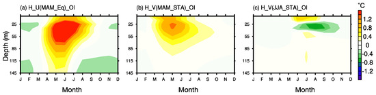 Depth-month distribution of the area-averaged temperature bias (unit: °C) over the ACT region during 1979–2005 for H_U(MAM_Eq)_OI (a); H_V(MAM_STA)_OI (b);and H_V(JJA_STA)_OI (c).