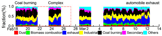 Source apportionment of particulates was conducted to obtain the emission-source spectrum of Shenyang; sampling was conducted on the basis of the local industry/energy structure [26]. Based on the observed results of SPAMS described above, and in accordance with the proposed technical guidelines for atmospheric particulate source apportionment [27] and the source spectral library of atmospheric pollutant emissions in Shenyang, the main sources were distinguished and analyzed. The sources of fine atmospheric particulates in Shenyang were divided into seven categories: coal-burning, industrial processes (non-combustion), mobile exhaust gas, dust, biomass combustion, pure secondary inorganic sources, and other sources (Figure 2).