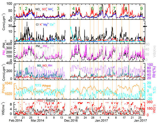 The principal components of atmospheric particulates were the water-soluble ions SO42−, NO3−, NH4+, K+, Cl−, Mg2+, and Ca2+. Figure 3 shows a time series of atmospheric visibility (Vis, km), relative humidity (RH, %), temperature (°C), wind direction, wind speed (m·s−1), and hourly concentrations of PM10, PM2.5, and TWSIs measured over the ambient observation period. According to “Haze Observation and Forecast Level” [28], atmospheric conditions where Vis < 10 km may be defined as haze when RH < 80% and as fog when RH > 95%. For RH values between 80% and 95%, atmospheric conditions are defined as a fog-haze blend, which requires further classification according to PM concentrations or surface observation standards. Nine haze episodes (total 582 h) were identified during the campaign in Shenyang (denoted by shaded sequences in Figure 3). As pollution episodes 2, 4, 7, 8, and 9 were associated with high RH, we describe them as smog pollution episodes. The remaining 960 h were identified as non-haze periods.